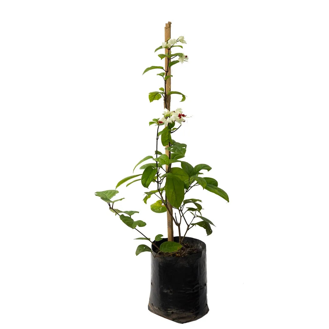 El Clerodendrum thomsoniae, conocido popularmente como corazón herido, es una planta trepadora tropical muy apreciada por sus flores blancas con un intenso centro rojo, que forman racimos llamativos durante gran parte del año. Su belleza exótica y su crecimiento vigoroso la convierten en una especie ideal para decorar pérgolas, rejas, muros y jardines verticales.